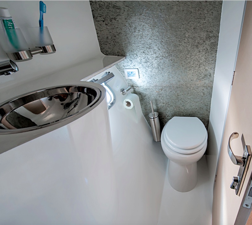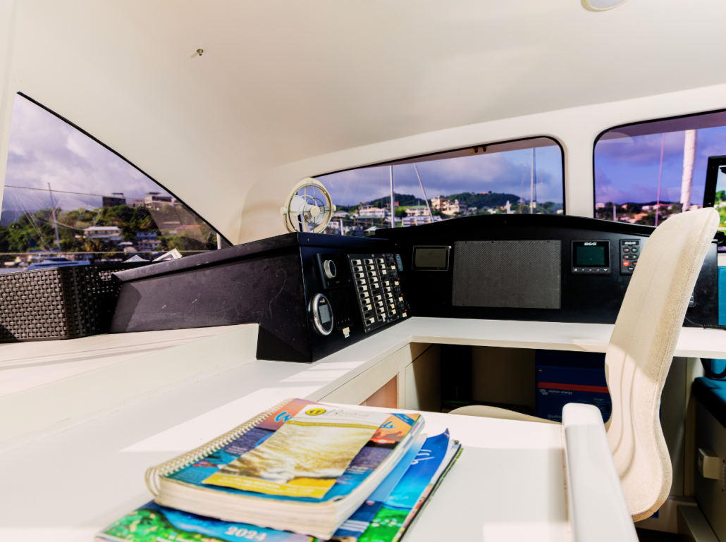 State-of-the-art technology is seamlessly integrated throughout Aonyx. A cutting-edge Victron power management system, coupled with reliable Battle Born Batteries, keeps all onboard systems such as air conditioning or water maker running smoothly. Complementing this is a Watt and Sea hydro generator and a large bifacial solar panel array, mounted on a sleek custom carbon fiber frame that minimizes weight while maximizing energy efficiency.
