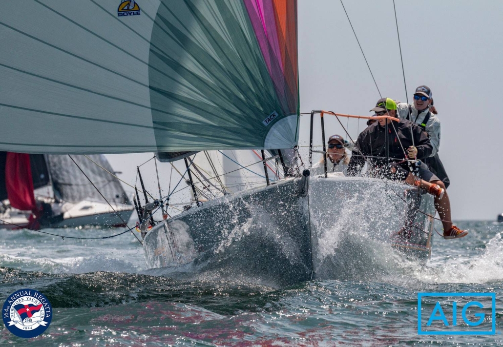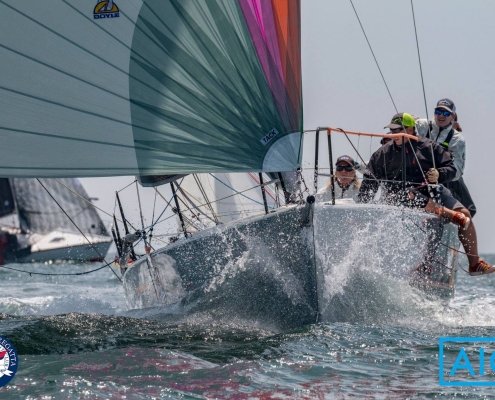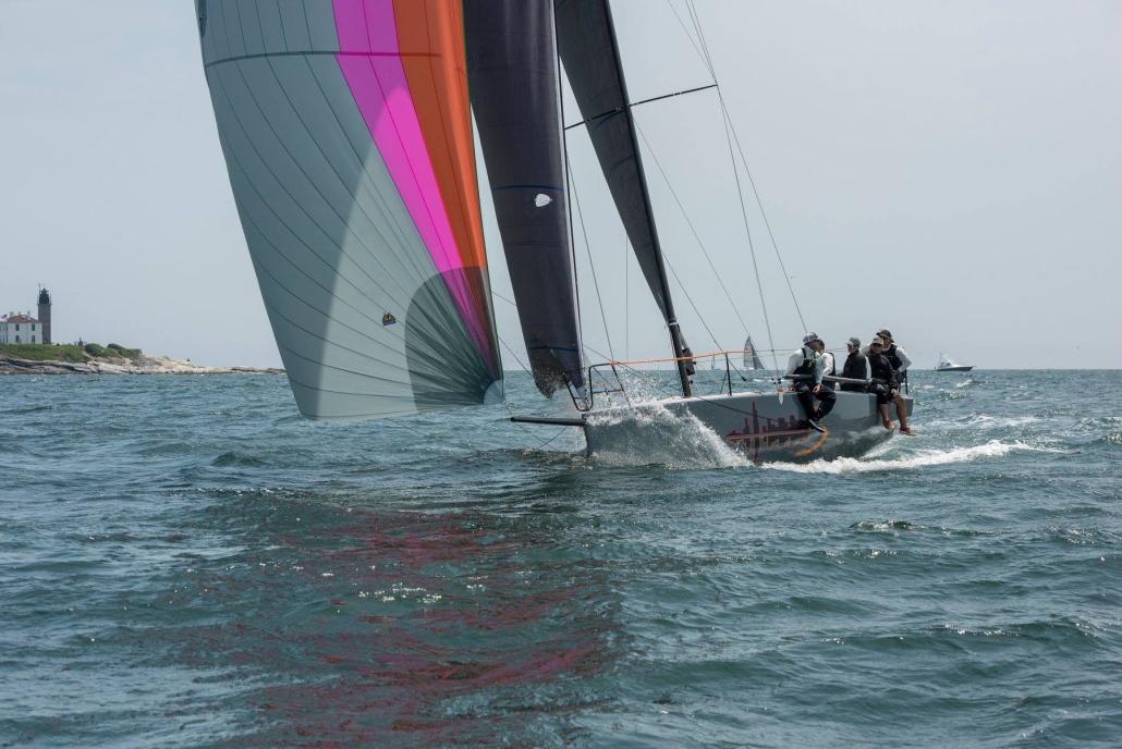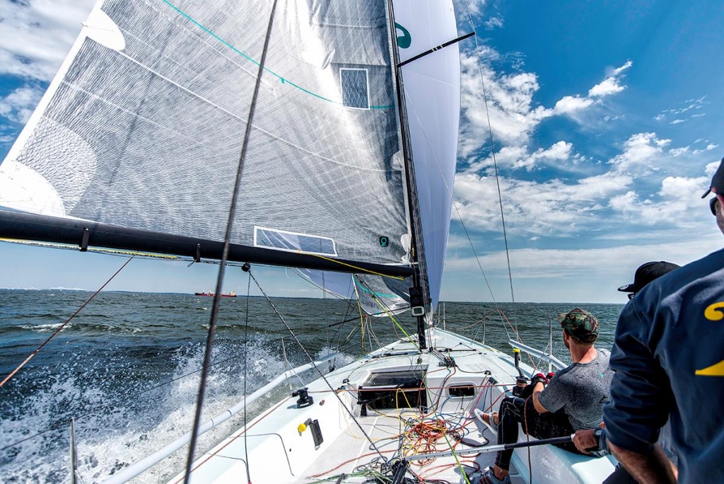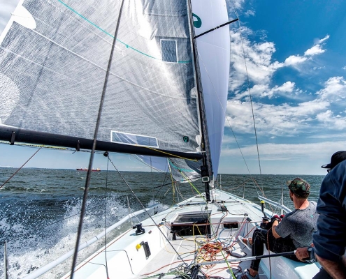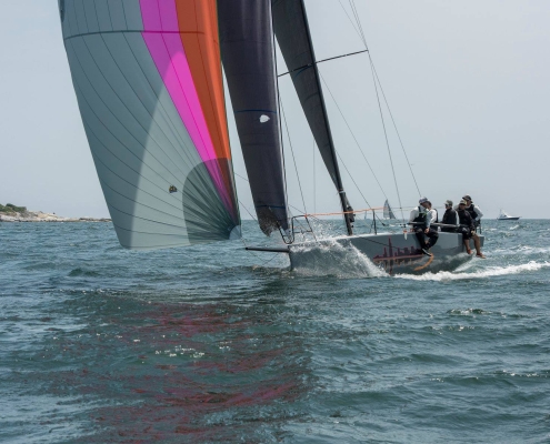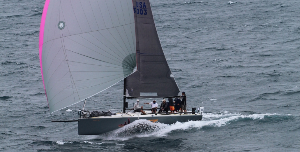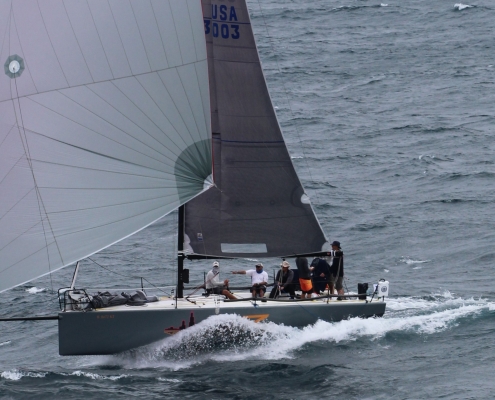 Constructed in cored, infused vinylester and E-glass, with carbon in frames and other structural members, the boat is tremendously stiff and light. The bowsprit is fixed with a bobstay—a necessity for Code 0s and BROs with their substantial luff loads. She is sailed with a crew of 7 to 8 and is carries asymmetrical spinnakers which are gybed from the cockpit. The spinnaker is doused by a string retrieval system, down the foredeck hatch, which runs the length of the yacht below deck.