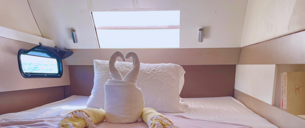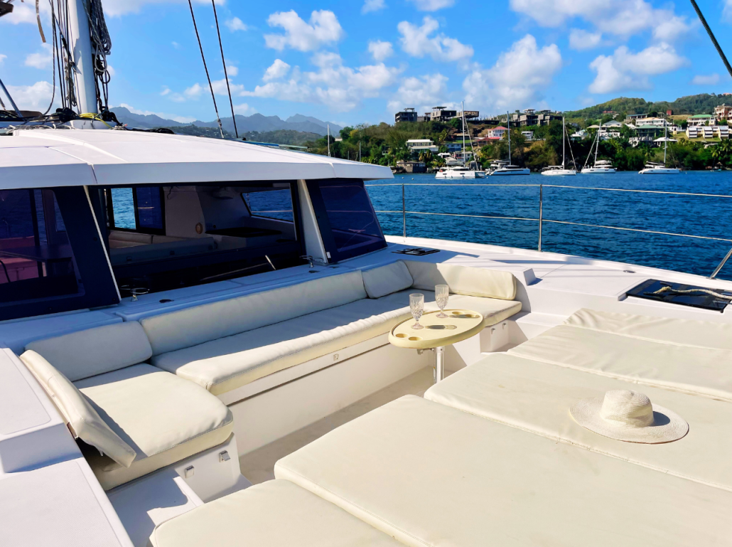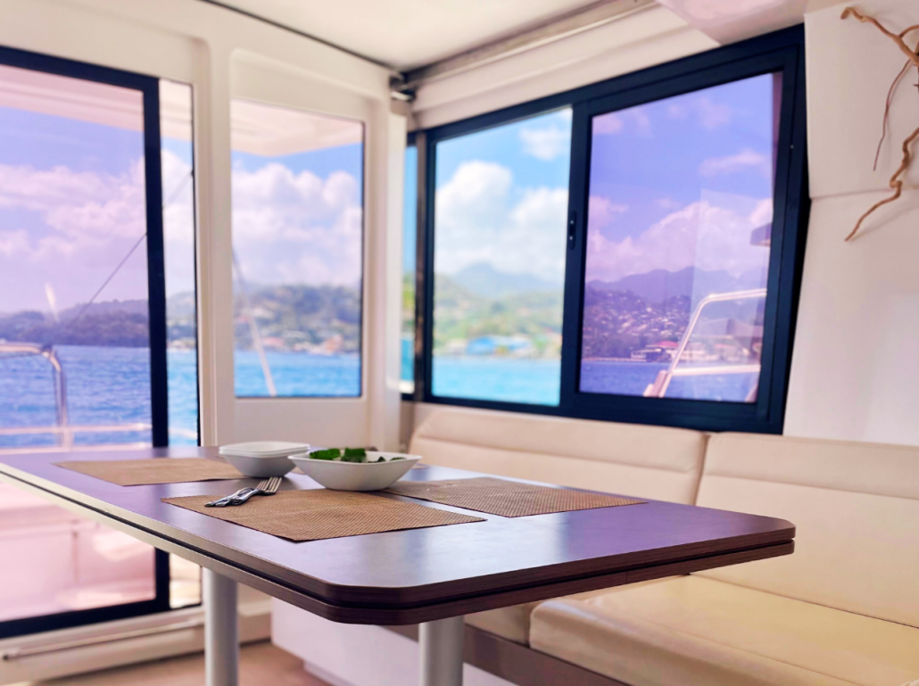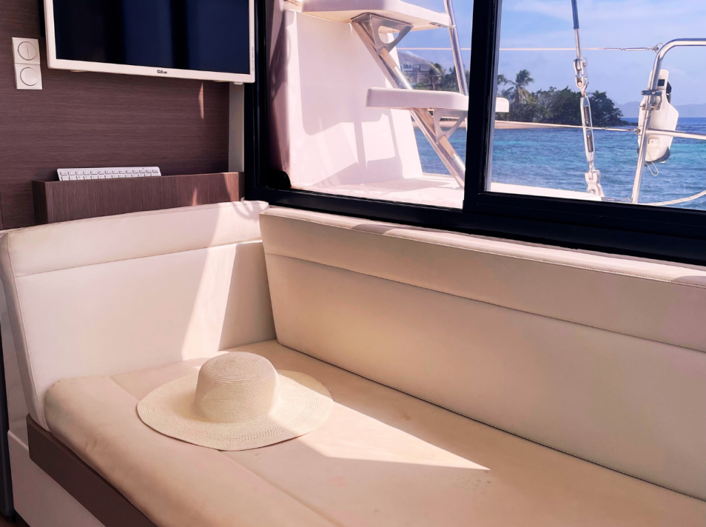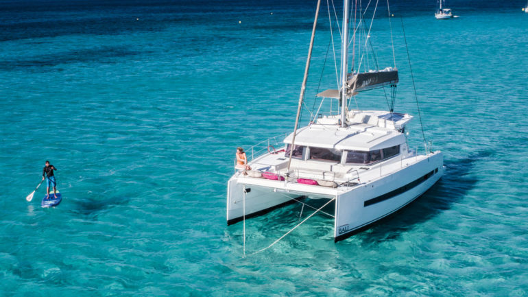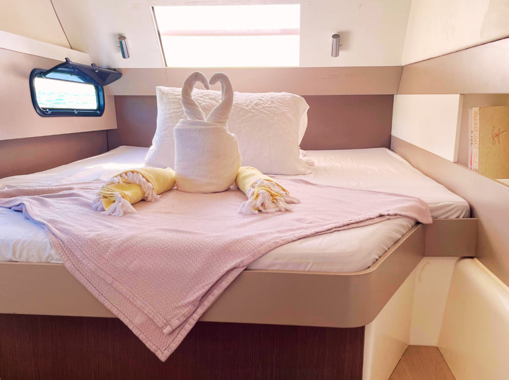 Our Bali 4.1 is a 2020 built catamaran with 3 staterooms and two heads. She is very easy to sail with a simple jib and main setup and electric winches. The owners stateroom takes up the entire port hull and has an en-suite toilet and shower. She is fully loaded with a generator, air conditioning, electric toilets, an entertainment system and even underwater lights to create that special ambiance in the evenings. The Bali 4.1, is the first sailing catamaran, totally bridged from its bows to its back boards, offering a fully open and ergonomic living space. Viewfinder has a large front cockpit with sun-beds and a removable awning along with a breathtaking relaxation area on the bridge deck for sunbathing. Viewfinder is pure luxury and the perfect boat to spoil yourself and your crew.